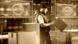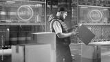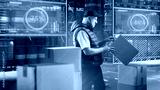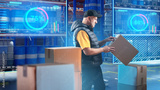 Man works in warehouse. Modern fulfillment technologies. Man storekeeper with boxes. Innovative fulfillment center. Data on warehouse shelf occupancy on virtual screens. Distribution, logistics.