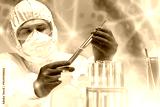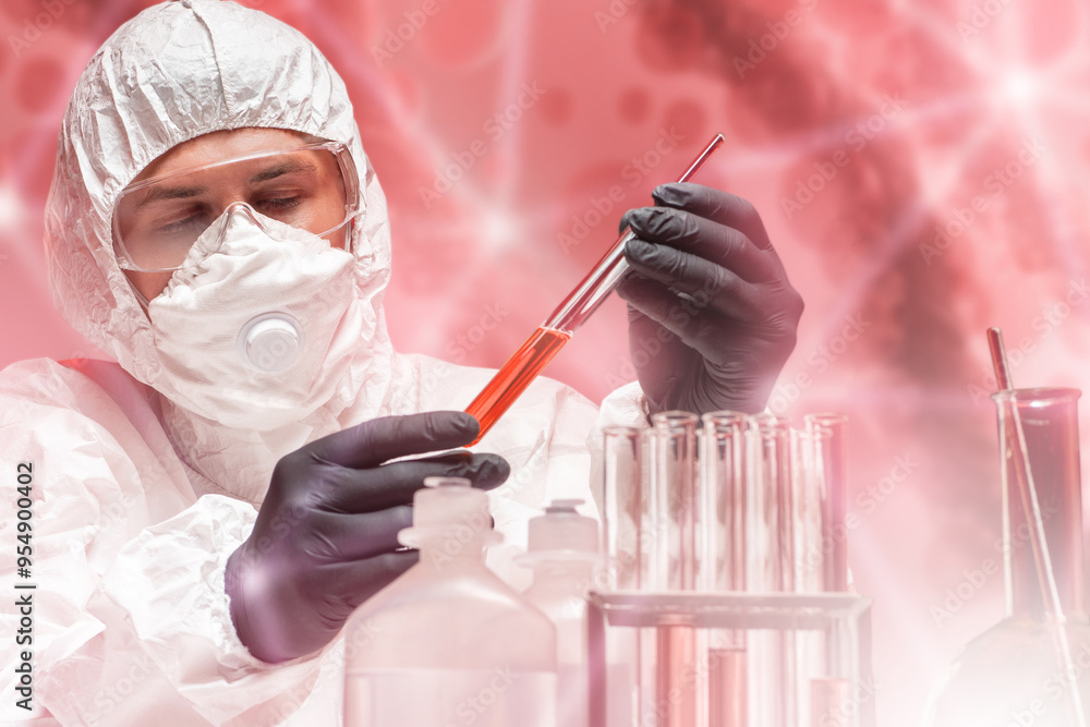 Man scientist holds flask. Laboratory technician at table with test tubes. Scientist in protective suit and mask. Laboratory assistant conducts experiments. Scientist virologist at work
