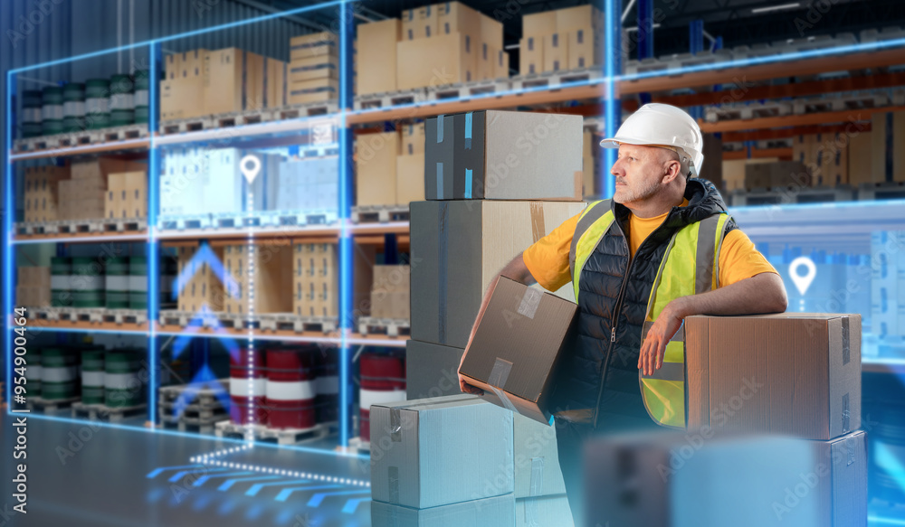 Man storekeeper. Supervisor guy standing in warehouse. Storekeeper with boxes in distribution center. Manager of modern storage. Man is storekeeper near shelves with parcels. Storeroom, storehouse