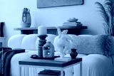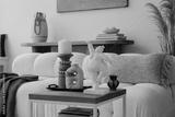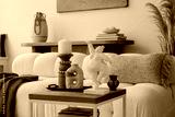 A subtle and serene interior with a unique sculpture, textured fabrics, and warm lighting. The neutral color palette enhances the tranquil and sophisticated vibe of the space..