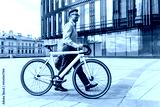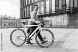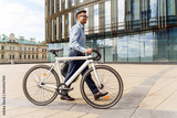 A man in business attire walks his bicycle past a modern office building, embracing a sustainable commute.