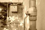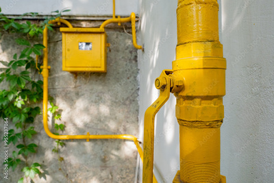 Gas equipment. Yellow pipe near wall of building. Gas equipment outside house. Cabinet with counter on wall of cottage. Gas equipment with lever to control pressure. Pipe for supplying propane.