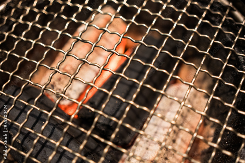 Close up of grille with hot charcoal grill stove. Japanese style yakiniku.