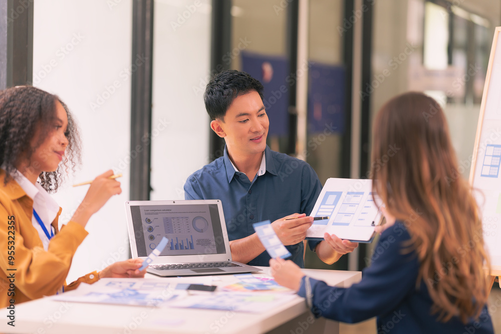 A team of UI UX web designers are working together to develop a mobile responsive website while discussing a project at a modern conference table. Brainstorming