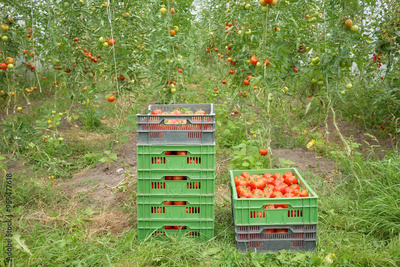 Tomatoes in boxes in a greenhouse, organic cultivation, selective focus.