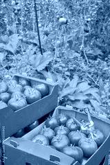 Tomatoes in boxes in a greenhouse, organic cultivation, selective focus.