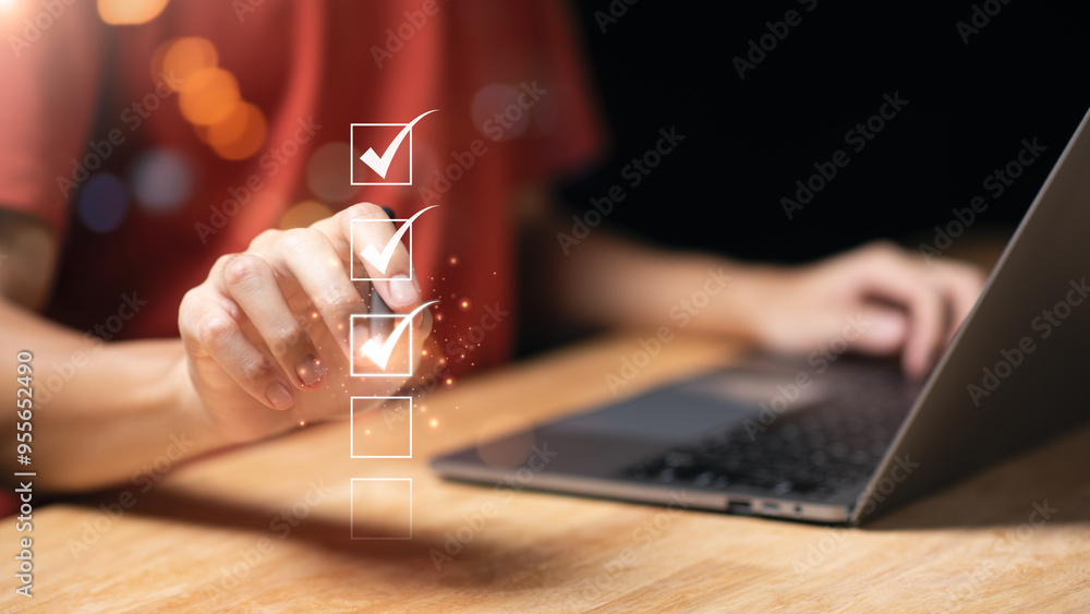inspector makes mark on the survey topic ,Checklist with checkmarks and checkboxes ,checklist ideas, online quality assessment ,checkbox to conduct opinion and quality surveys or satisfaction