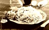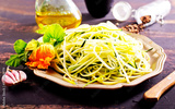 Raw zucchini noodles on plate. Zucchini spaghetti in metal bowl.
