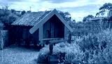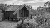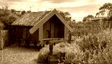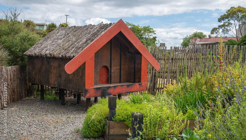 A red hut in traditional Maori garden in Hamilton garden, New Zealand. They spread ash over the garden and added sand and gravel to heavy loam and clay soils.