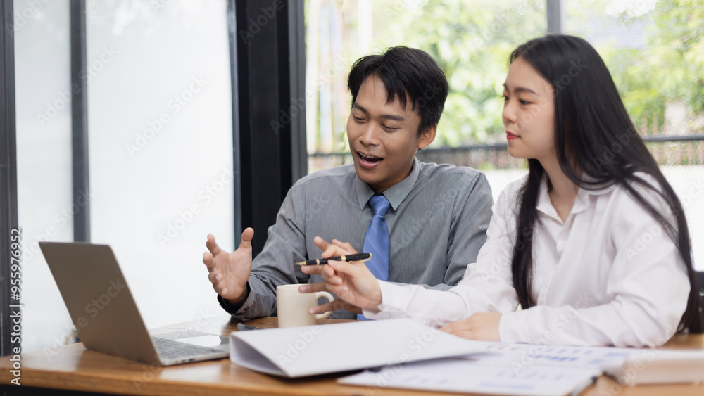 Business financial advisory services concept. Business teamwork and working on digital laptop computer with advisor showing plan of investment to clients at table office. Digital marketing.