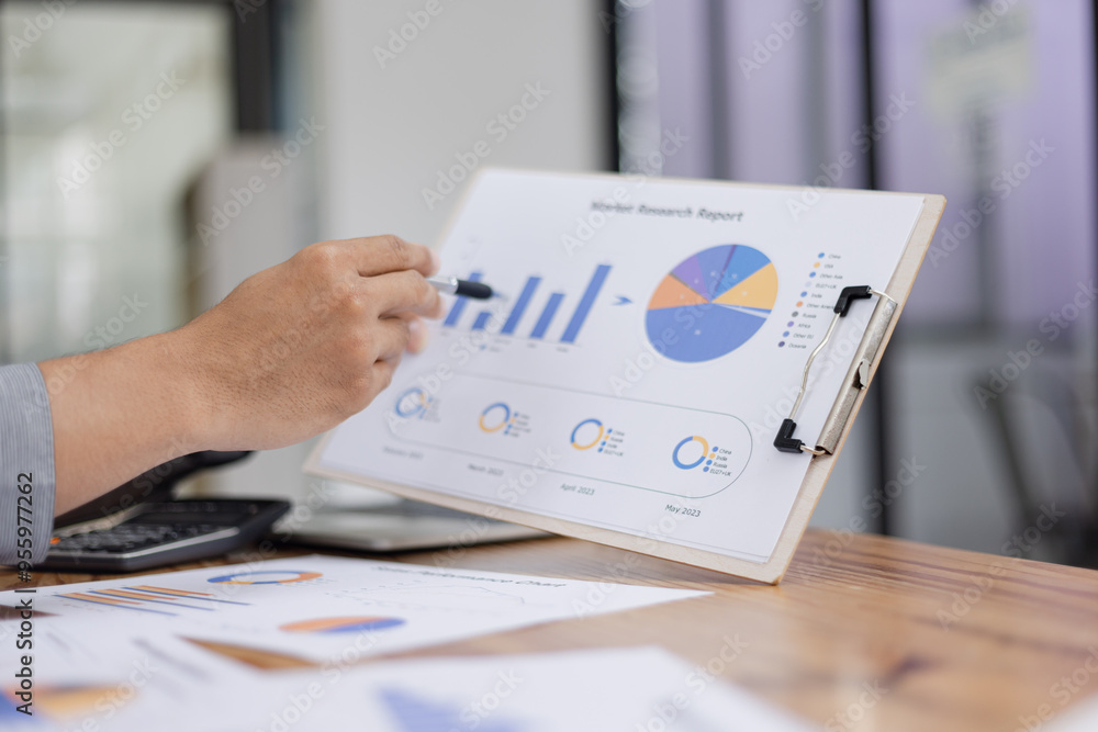 Business financial advisory services concept. Business teamwork and working on digital laptop computer with advisor showing plan of investment to clients at table office. Digital marketing.