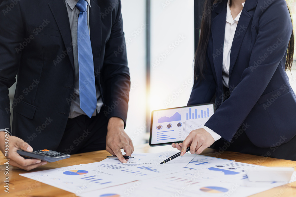 Business financial advisory services concept. Business teamwork and working on digital laptop computer with advisor showing plan of investment to clients at table office. Digital marketing.