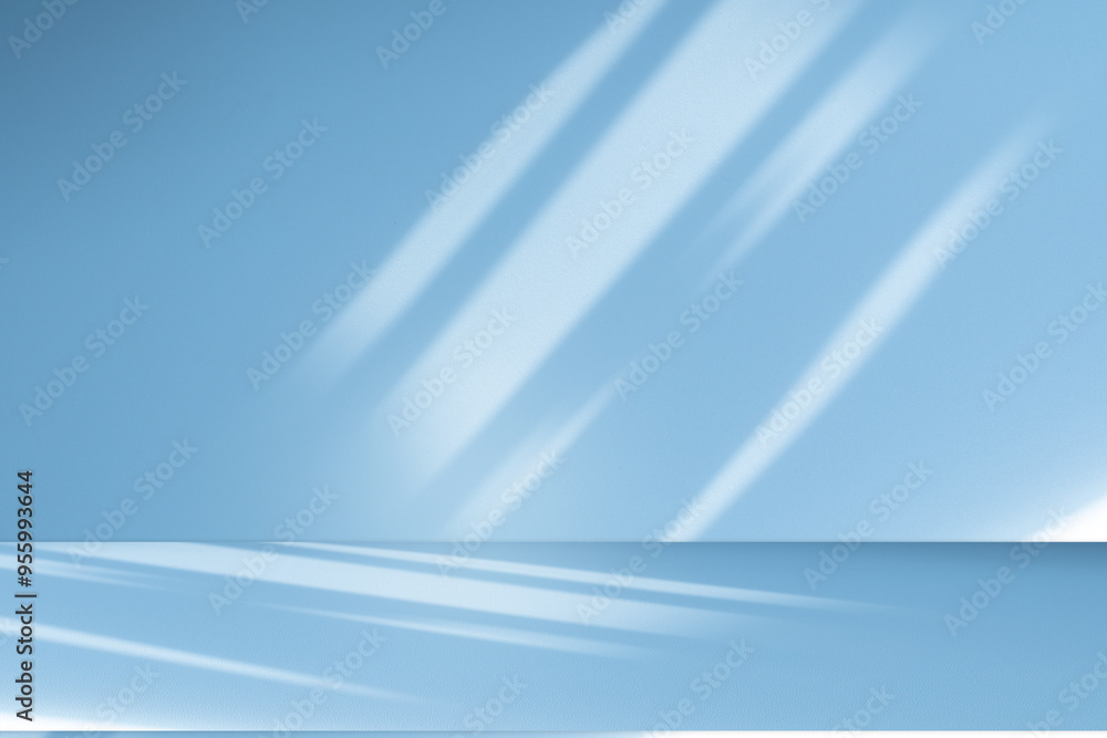 Studio style background wall decoration presentation uses white and blue tones. with shadows cast from a nearby window, concept creating a decorative backdrop.