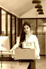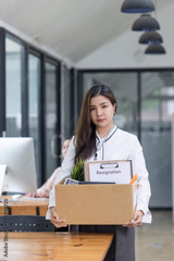 Young asian woman employee with a storage box for the equipment after resigning and stressed from work.