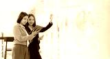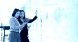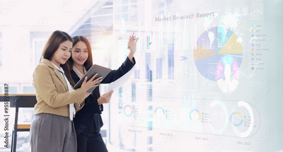 Two Asian young businesswomen with analyzing financial data charts and business presentation plan in the modern office, Business financial documents and planning idea project concept.