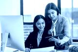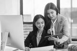 Two Asian young businesswomen working on computer with analyzing financial charts in the modern office, Business financial documents and planning idea project concept.