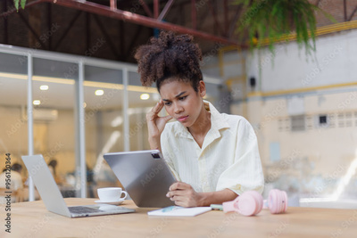 Young African American woman are stressed and tired from work sitting at desk in the office, feeling sick at work, stress from work.