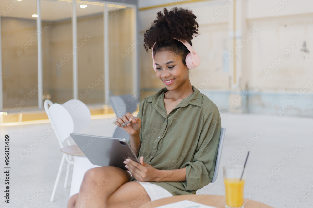 African American young woman using tablet with wear headphones and sitting relaxing.