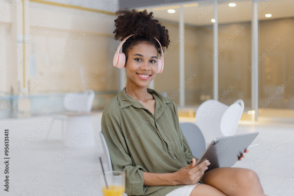 African American young woman using tablet with wear headphones and sitting relaxing.