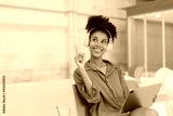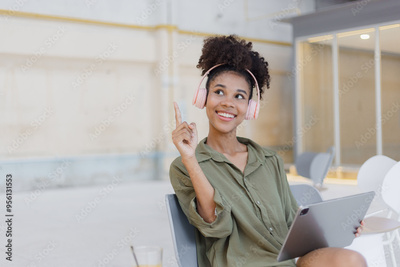 African American young woman using tablet with wear headphones and sitting relaxing.