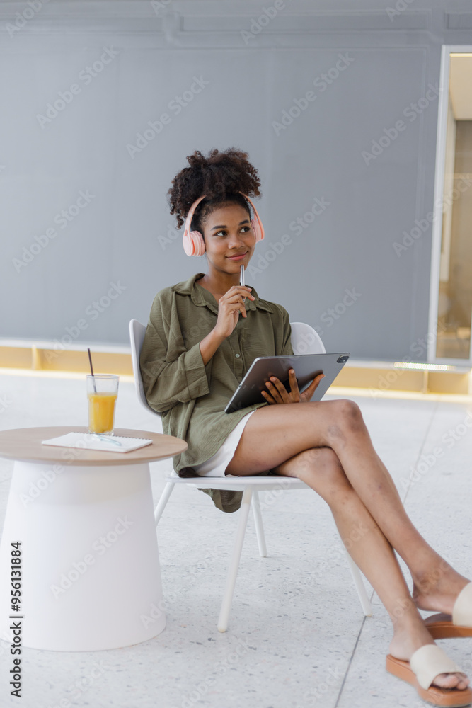 African American young woman using tablet with wear headphones and sitting relaxing.