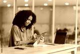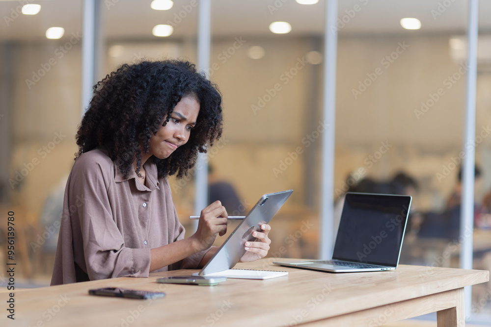 African American businesswoman excited by the good news on the tablet sitting at office desk.