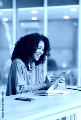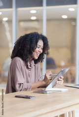 African American businesswoman excited by the good news on the tablet sitting at office desk.