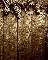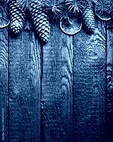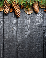 Vertical Christmas or New Year background with a border of green fir tree branches, dried lime slices and pine cones. Rustic wooden Ornament Border Background