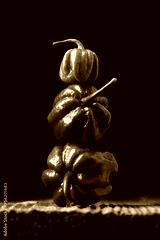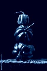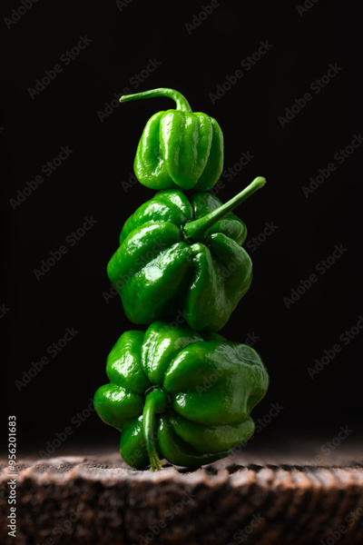 Tower from ripened green habanero peppers (capsicum chinense) on black background. Very hot mexican peppers on rustic wooden table close up
