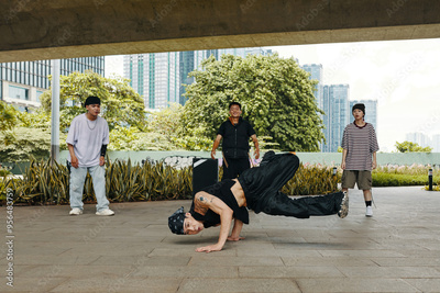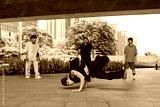 Urban dancers showcasing breakdancing skills in park surrounded by tall buildings. Participants observing performance with trees and greenery in background