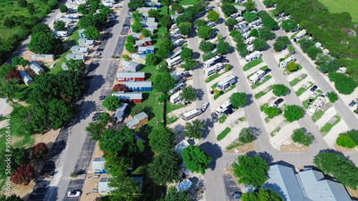 Row of colorful cottage mobile home retreat vacation rentals, full hookup RV site in New Braunfels, Texas Hill Country, concrete pads electric service for recreational vehicles suburb San Antonio