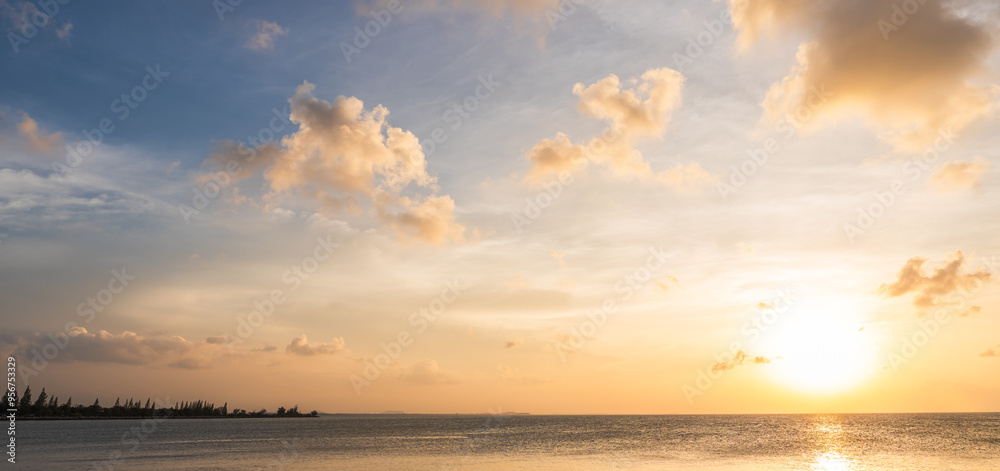 Sunset sky clouds over sea in the evening with orange, yellow sunlight on golden hour, horizon sea landscape nature background, dusk sea sky