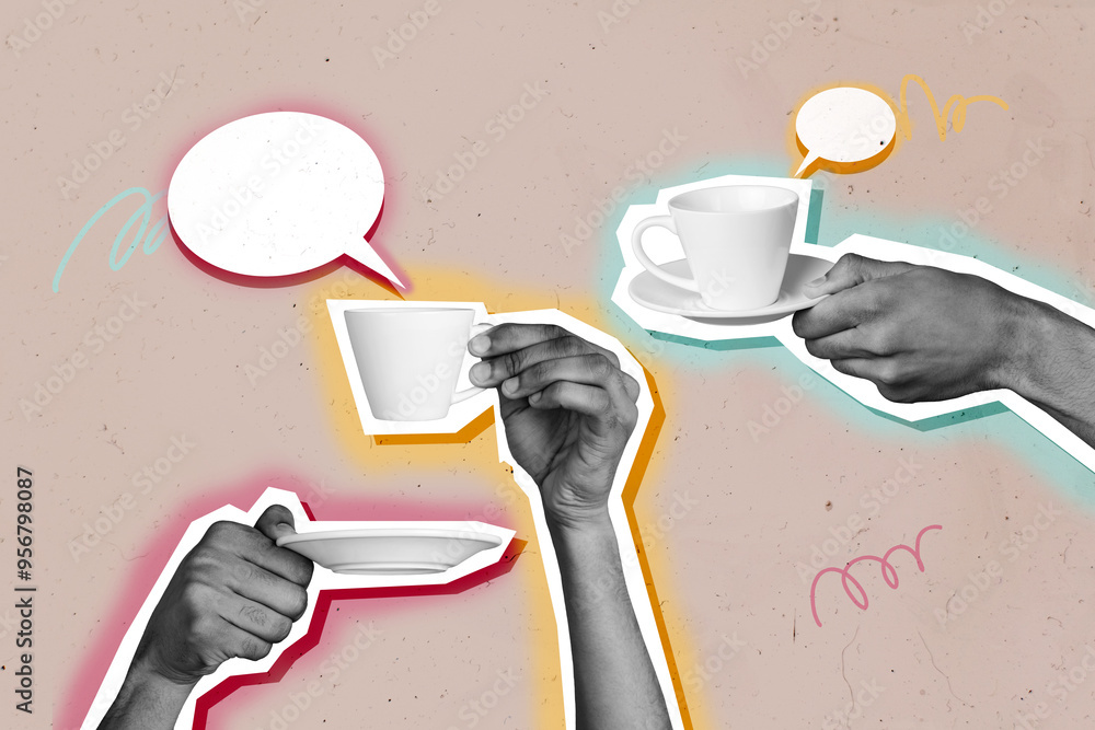 Creative trend collage of hands hold coffee cups break speech bubble talking weird freak bizarre unusual fantasy