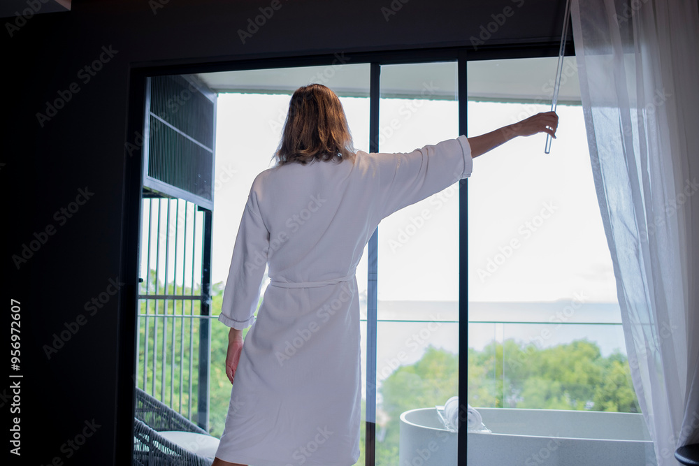 Beautiful woman standing in a modern room wearing a white bathrobe while looking expression with holidays relaxing concept.