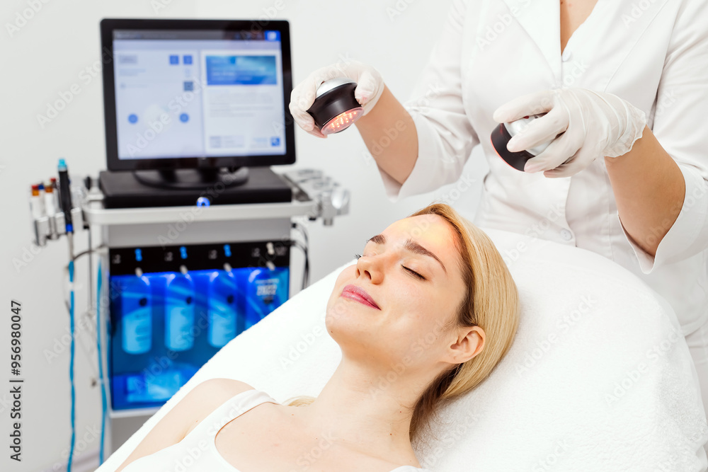 A woman undergoes LED light therapy, a non-invasive facial treatment to rejuvenate and enhance skin texture. Perfect for showcasing advanced skincare solutions for a youthful glow.