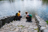 A stone embankment with steps. A woman and a man are sitting at the edge of the embankment by the water