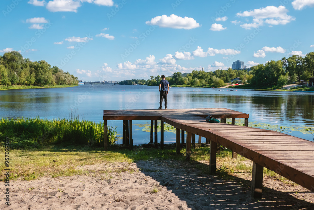 A teenager stands at the edge of a wooden embankment with a beautiful view of the river and forest.