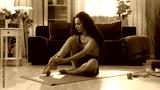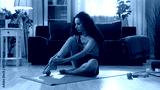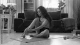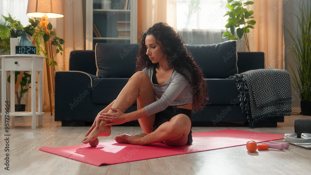 Healthy fit concentrated Hispanic Arabian ethnic woman female girl lady sportswoman massaging leg foot with rubber ball on foam mat myofascial release feet massage body relaxation indoors living room