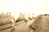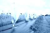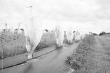 Fabrics weed barrier on row of young citrus plants under high-density polyethylene mesh cover to prevent Asian citrus psyllid ACP spread greening disease at grapefruit orchard in Hargill, Texas