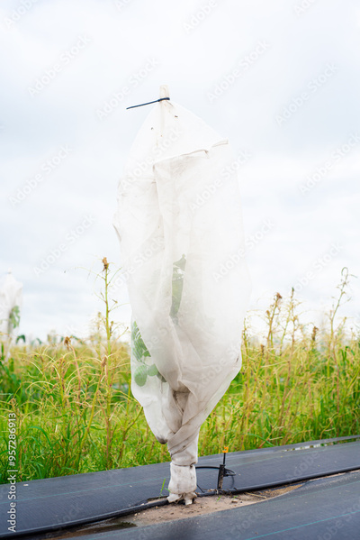 Fabrics weed barrier on row of young citrus plants under high-density polyethylene mesh cover to prevent Asian citrus psyllid ACP spread greening disease at grapefruit orchard in Hargill, Texas