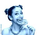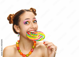 Girl eating colourful lollipop. Lollipop. Isolated on white background