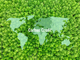 Carbon credit concept. Globe and world map above green mangrove forest. Natural carbon sinks. Mangrove trees capture CO2 in blue carbon ecosystems, mitigating global warming. Green ecosystem.
