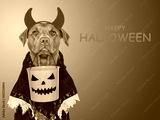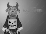 Happy Halloween. Charming dog and Halloween costume. Isolated background. Close-up, indoors. Studio shot. Congratulations for family, relatives, loved ones, friends, colleagues. Pet care concept