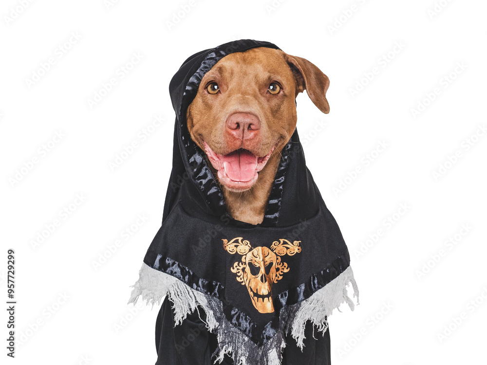 Happy Halloween. Charming dog and Halloween costume. Isolated background. Close-up, indoors. Studio shot. Congratulations for family, relatives, loved ones, friends, colleagues. Pet care concept