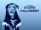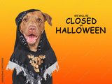 Signboard with the inscription We will be closed on Halloween. Charming dog and Halloween costume. Closeup, indoors. Studio shot. Pets care concept