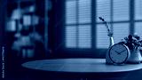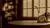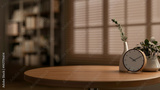 A round wooden table featuring an alarm clock, decorative plants, and a copy space.