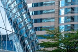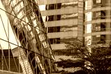 Two modern glass buildings reflect the sky and each other in Hong Kong, China. A tree branches into the frame, partially obscuring the building.