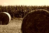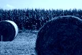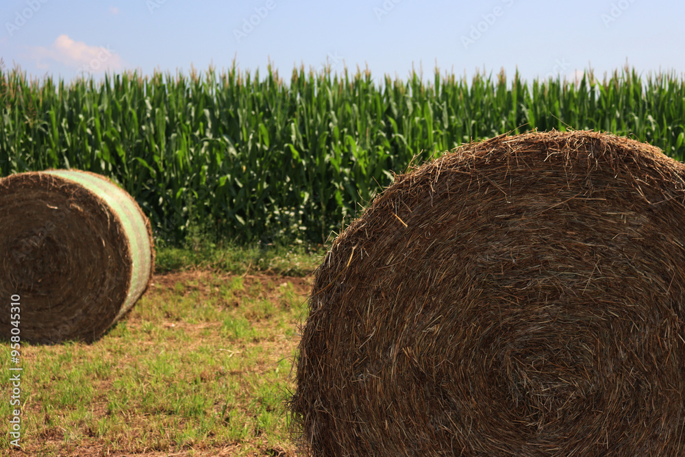 Green hay bales in rows in the mowed meadow near corn field in the italian countryside on summer