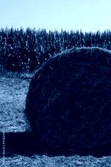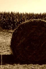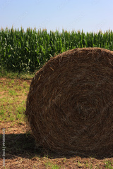 Green hay bales in rows in the mowed meadow near corn field in the italian countryside on summer