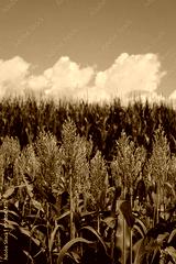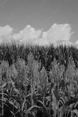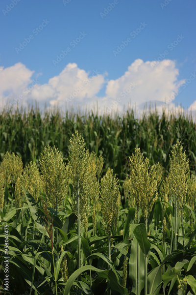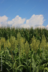 Green Sorghum field near corn field agaisnt blue sky with white clouds. Sorghum plants growing in the field